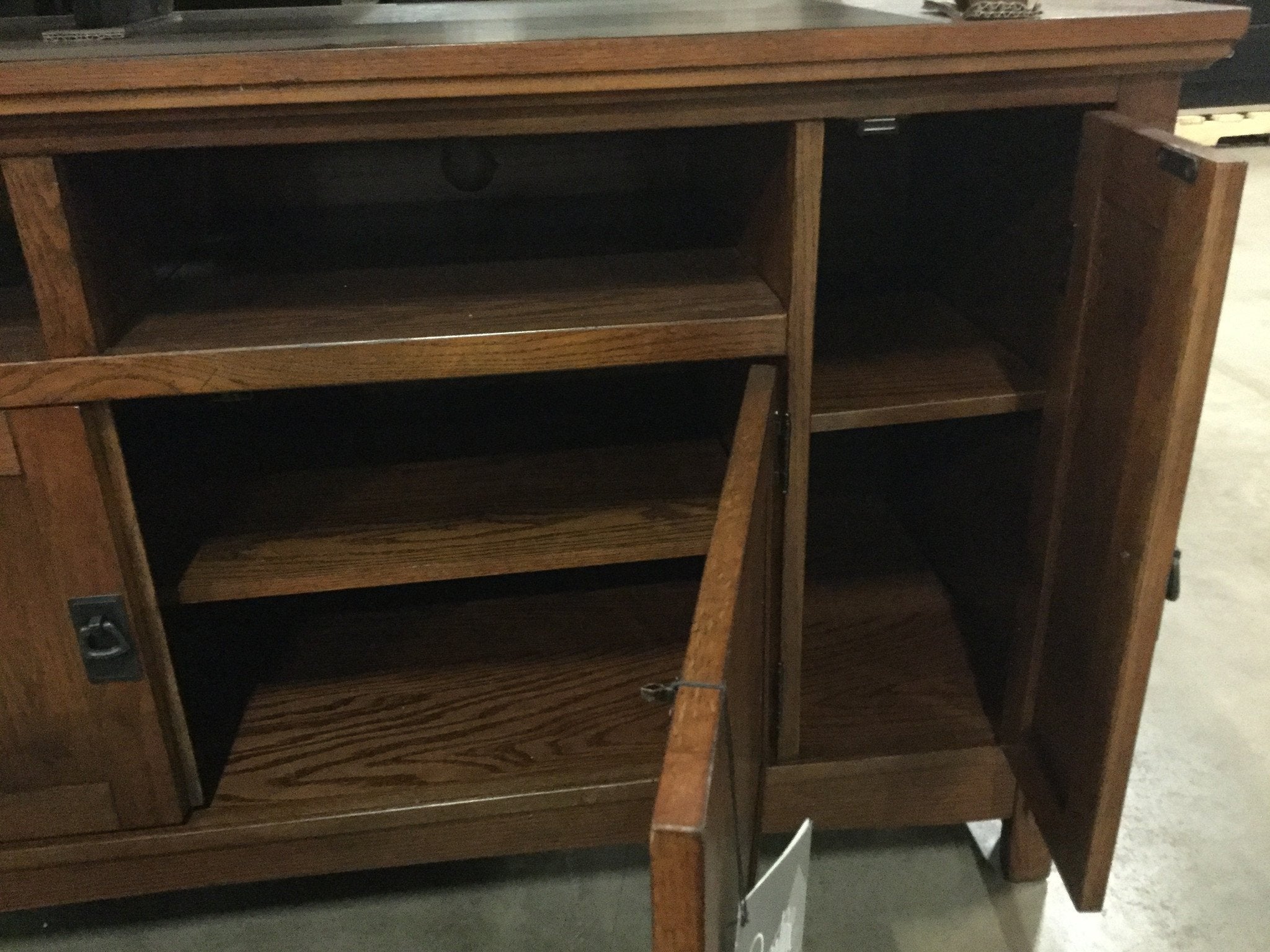 | Item Description: | A big hit with fans of Arts and Crafts and Mission-style design, the Cross Island large TV stand deserves a standing ovation for its form and function. While it certainly charms with details, including replicated mortise-and-tenon corner work and cast hardware in an aged-bronze-tone finish—it’s got loads of functionality, including cord management, adjustable shelving and vented media storage. |