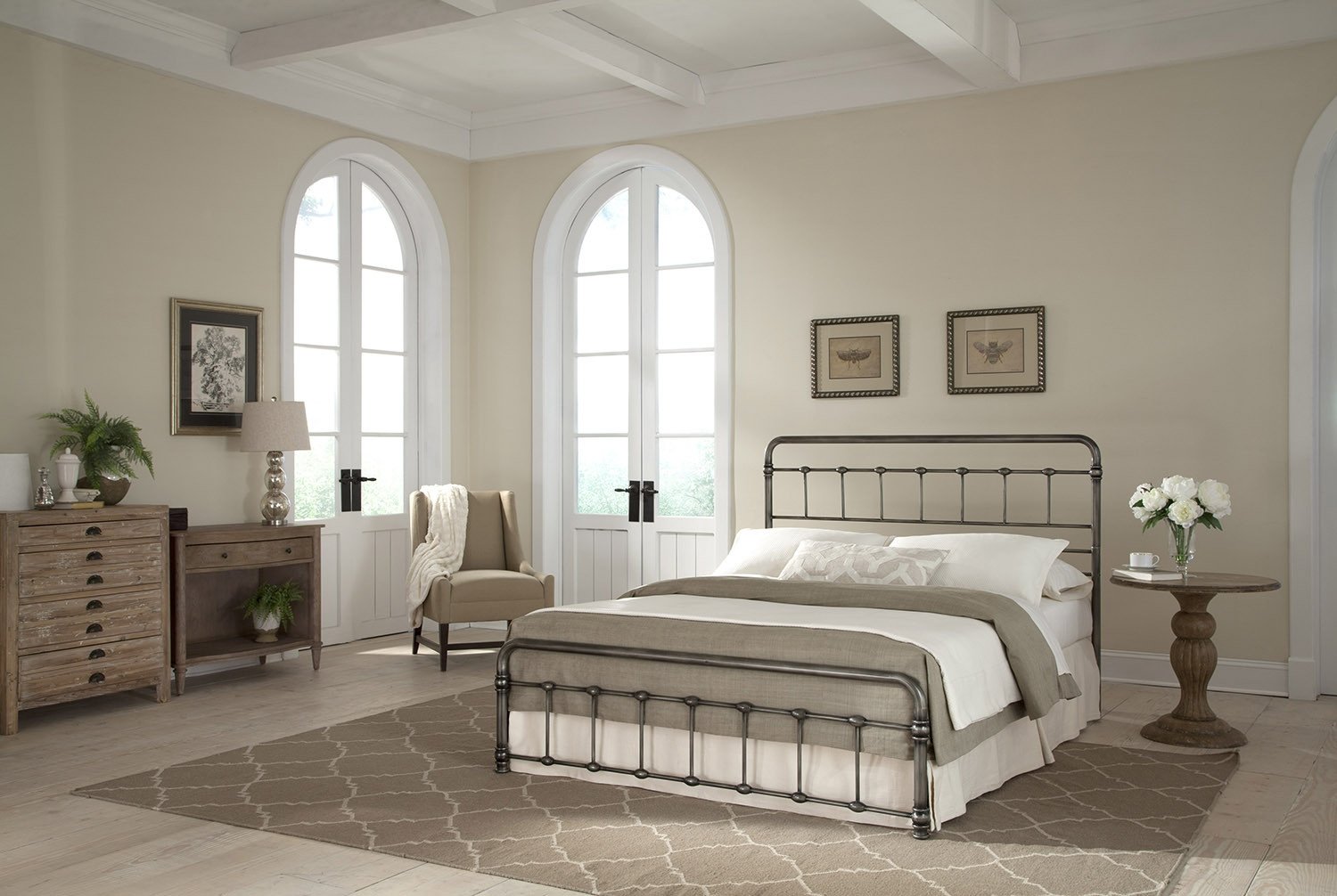 Transitional style bed with rounded edges, frame out straight clean lines in the headboard and footboard. The Weathered Nickel finish adds detailto this clean and simple bed design.