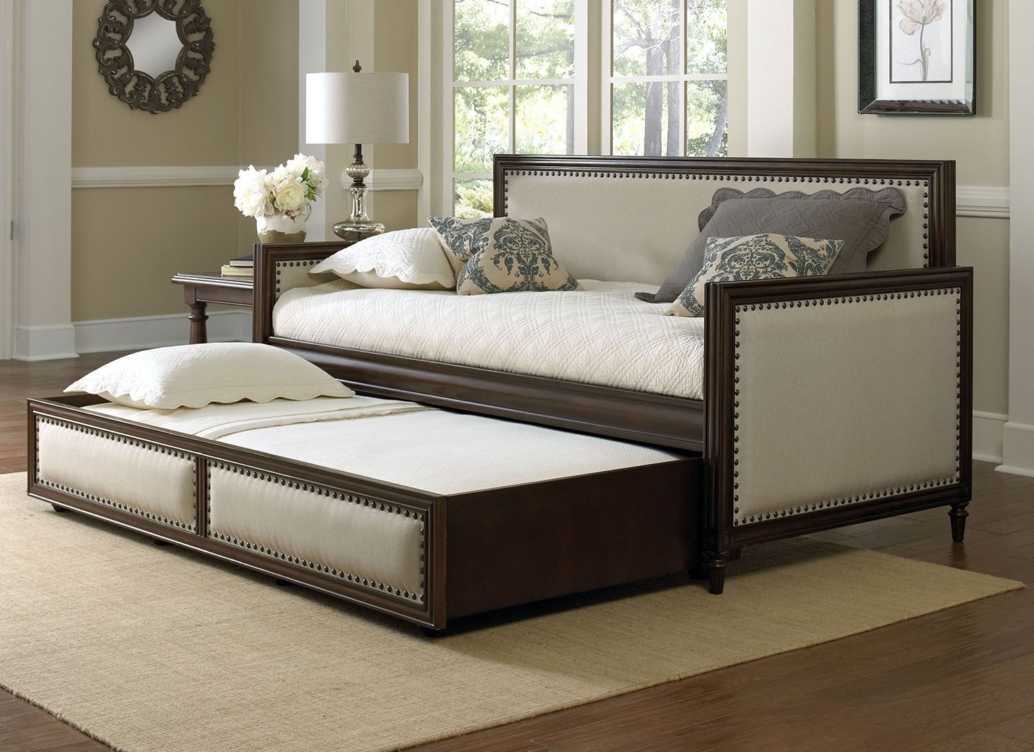 Remarkably refined, the Grandover Daybed is a stunning centerpiece in any room. Upholstered in a rich Cream fabric, the back and side panels are rimmed with antique brass finished nail heads which add a dimension of detail to the entire look. The upholstery is set in a rich Espresso wood finish that enhances the sophistication of this piece. With an optional roll-out trundle that can be used for storage or as an additional sleeping space, the Grandover Daybed is truly versatile. It comes complete with a support surface so a link spring is not needed.