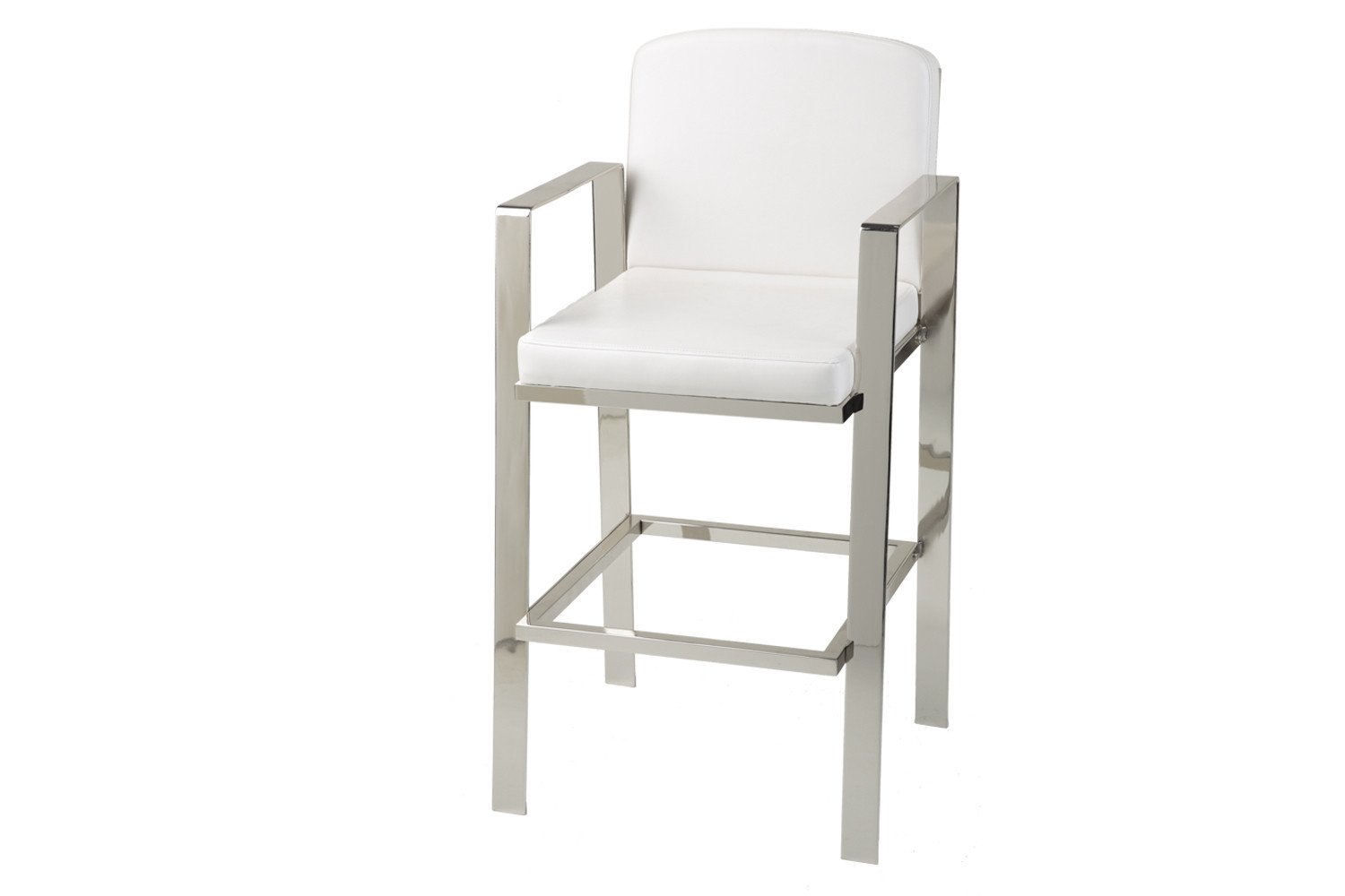 The Juneau bar stool features a brilliant white leather upholstery that is graceful and eye-catching. Shiny chrome legs and arms offset the seat and offer a stunning seating option for your kitchen. Relax in comfort and style with the Juneau.