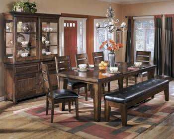 | Series Features: | Made with select veneers and hardwood solids. Rich burnished dark brown wood finish. Planked and framed construction table tops have thick built-up edge. Massive table legs have a two-sided taper shape. The buffet has recessed side panels. The buffet doors feature wide framed construction w/deep beveled raised panels. China has deep beveled solid wood crown moulding. China is lighted w/tempered glass shelves and mirrored back. Deep bevel profiled drawers are felt lined for silverware storage. Chairs have strong horizontal rail design. Chair cushion is covered in a stitched faux leather. |